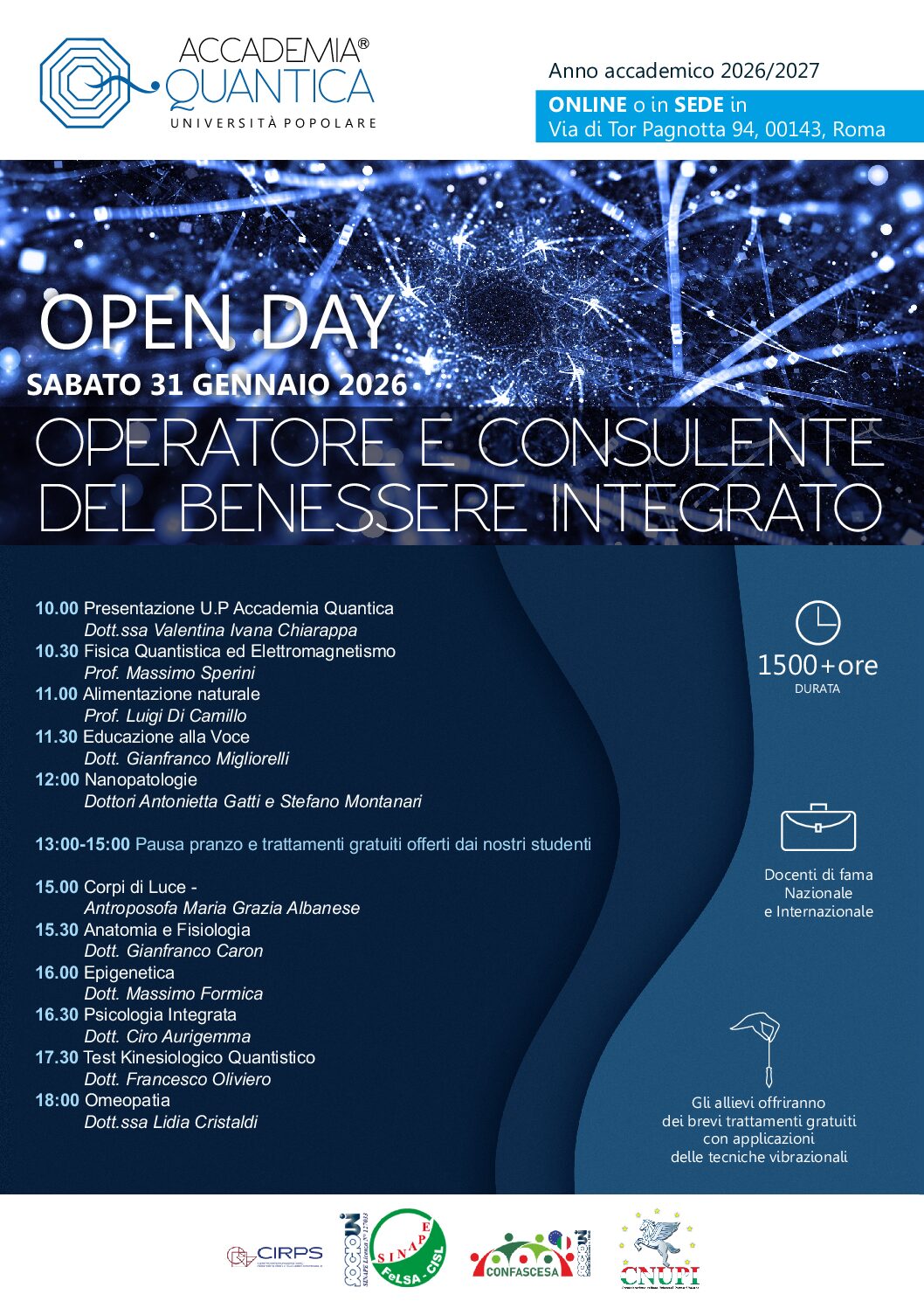 L’Università Popolare Accademia Quantica organizza corsi di durata biennale e triennale che formano la figura dell’Operatore del Benessere Integrato, del Consulente del Benessere Integrato e del Naturopata ad Indirizzo Psicoenergetico.